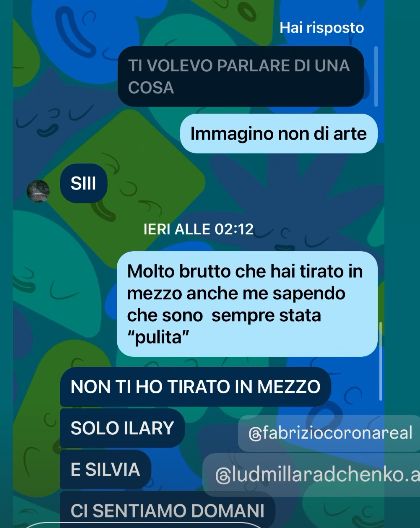 Il sospetto della Radchenko è immediato: “Non di arte immagino”, a cui segue un affondo sulla reputazione: “Molto brutto che hai tirato in mezzo anche me, sapendo che sono sempre stata pulita”. Corona cerca di scagionarsi con il suo tipico stile concitato: “NON TI HO TIRATO IN MEZZO. SOLO ILARY E SILVIA. Ci sentiamo domani?”.